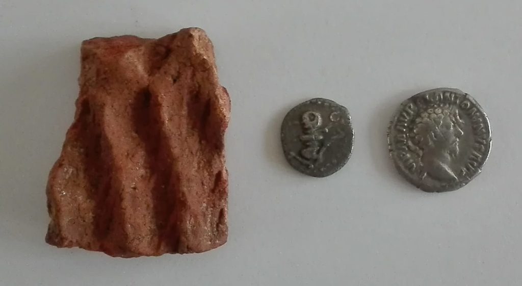 - eine Keramikscherbe aus der Grabungskampagne 2019 (frühe Eisenzeit, ca. 800 bis 750 v. Chr.),