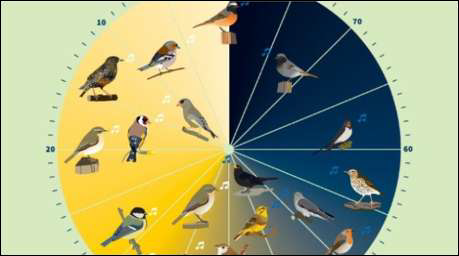 Der Vogelgesang richtet sich nach dem Sonnenaufgang. Dementsprechend folgt auch die Zeitangabe. So singen beispielsweise der Star 15 Minuten und die Kohlmeise 30 Minuten vor dem Sonnenaufgang. Der Gartenrotschwanz ist mit einem Gesang 80 Minuten vor dem Morgenrot ein echter Frühaufsteher.
