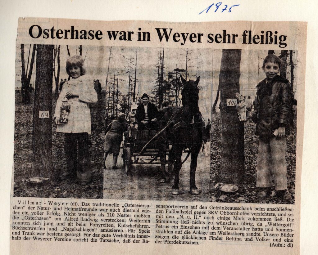 Anfang der 70er Jahre wurde das Ostereiersuchen von den Natur- & Heimatfreunden Weyer ins Leben gerufen. Damals ging alles noch sehr geordnet zu. Der Verein baute Osternester aus Zweigen und Moos in der Nähe des Waldspielplatzes, bestückte sie mit Eiern sowie anderen Leckereien und versah sie mit Nummern. Der Inhalt der Nester konnte von den Familien vorab „käuflich“ erworben werden. Die Kinder suchten „ihr“ Nest und durften dann den Inhalt mitnehmen. Weitere Kinderbelustigungen waren das Ponyreiten, Kutschefahren, Büchsenwerfen und Nagelschlagen. Über den Besuch des Osterhasen im Jahr 1975 berichtete auch die Presse: