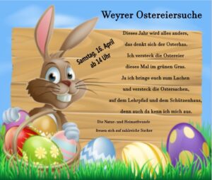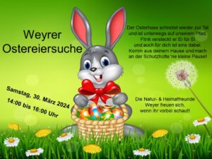 Fleißige Helfer haben die Geschenke verpackt. Es gab einen leckeren Hefehasen der Bäckerei Roth und ein gefärbtes Ei vom Hühnermobil der Familie Weber. Der Osterhase hoppelte am Lehrpfad entlang und an der Schutzhütte vorbei und hat die vielen Tüten versteckt. Dieses Jahr gab es auch für die Erwachsenen eine Kleinigkeit an der Schutzhütte. Passend zu Ostern gab es Eierlikör, Rübli-Muffins, leckere Kekse und verschiedene Kaltgetränke für alle, die eine Stärkung brauchten und eine wunderschöne Aussicht auf Weyer haben wollten. Ich habe lachende Kindergesichter gesehen und mich über die zahlreichen Sucher gefreut. Die Natur- & Heimatfreunde Weyer bedanken sich bei der Bäckerei Roth, der Familie Weber und allen Helfern.