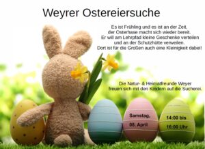 Die Natur- & Heimatfreunde Weyer stürzten sich voller Eifer in die Neugestaltung der Ostereiersuche – ohne aufwändigen Nesterbau und Nummernvergabe, aber wieder mit vielen Leckereien für die Kleinen. Neben Schokoeiern und -hasen gab es je ein hartgekochtes Osterei für insgesamt 100 Beutel, die anstelle der Moosnester entlang des Lehrpfades an die Büsche gehängt und auf Baumstümpfen platziert wurden. Vielen Dank an die Familie Weber für die Spende der gefärbten Eier. An der Schutzhütte am Wasenschlag konnten sich die kleinen und großen Sucher mit Getränken versorgen und die Aussicht genießen. Die Kinder haben sich sehr gefreut über die Ostersuche, waren aber so bescheiden, dass sie nur jeweils einen Beutel mit nach Hause nahmen. So konnten die Natur- & Heimatfreunde Weyer den Rest an vier ukrainische Kinder im Dorf und an den Kindergarten verschenken.