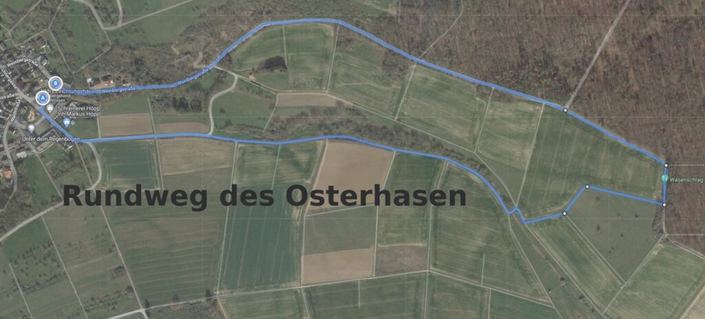 Der Osterhase ist wieder unterwegs. Am Ostersamstag, 30.3.2024, findet die Ostereiersuche ab 14 Uhr auf bewährter Strecke entlang des Lehrpfades bis zur Schutzhütte am Wasenschlag (Karte siehe oben im Text) statt.