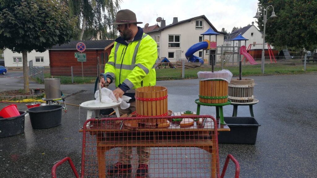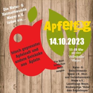 Bei schönem Wetter war der erste Apfeltag in Weyer am 14. Oktober 2023 ein voller Erfolg. Ausgerichtet wurde die Veranstaltung von den Natur- & Heimatfreunden Weyer (N&H) mit Unterstützung des Obst- und Gartenbauvereins Weyer, den Landfrauen Weyer und der Kindertagesstätte „Unter dem Regenbogen“ Weyer. Tamara Dahlmann (N&H) hatte die Organisation übernommen. Sie konnte Elmar Reifenberg gewinnen, der das Apfelfest vor 17 Jahren in Bad Camberg ins Leben gerufen hat. Er unterstützte den Apfeltag in Weyer mit seinen eigenen Geräten – einem Obsthäcksler und einer manuellen Obstpresse.